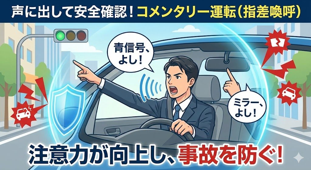 交差点で発進する際に「青信号よし!」と声に出すことが、より注意力を増し、実際に運転ミスが起きづらくなり、事故が減るそうです。