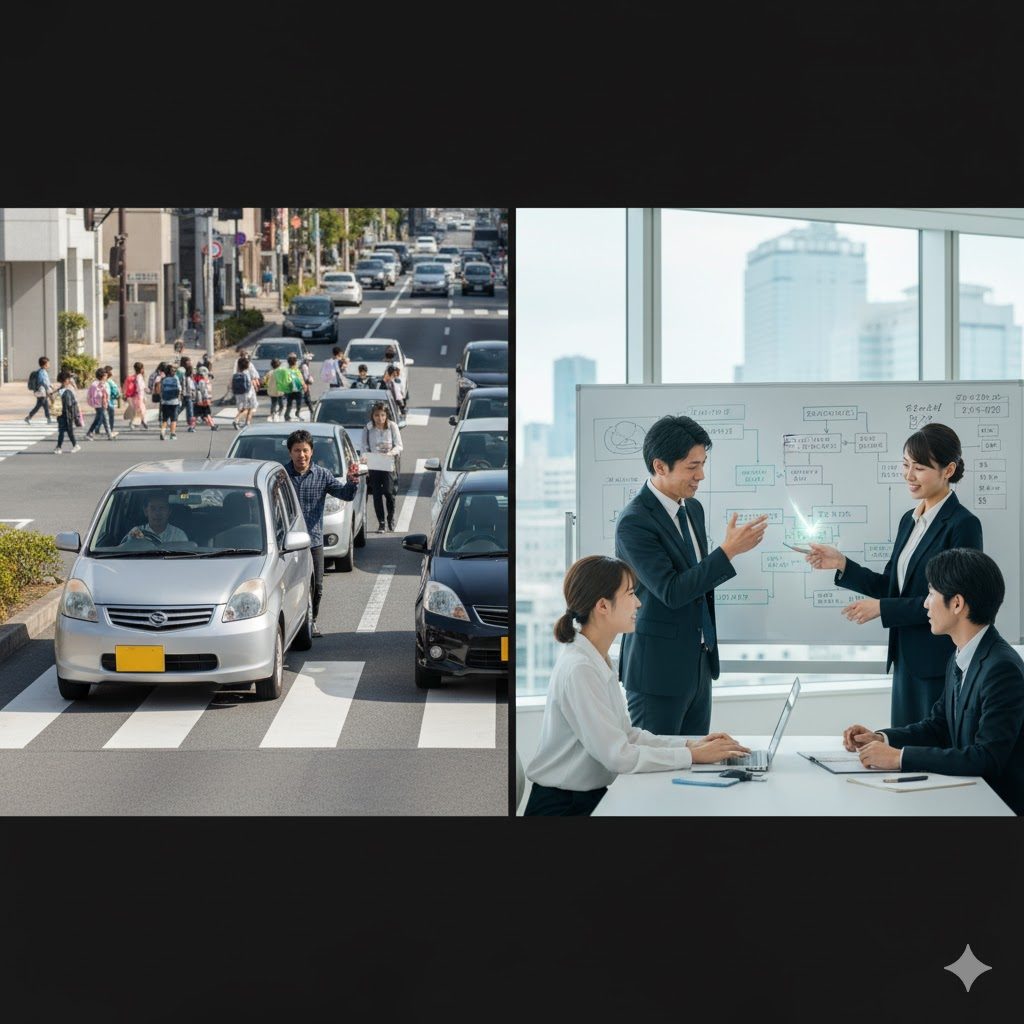 それはよいのですが、もう少し左に寄って停車してくれたら、僕、直進できるんですけど