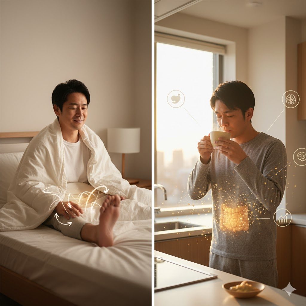 胃腸を温めて蠕動運動を促すと朝食の負担を軽減できる為です。白湯が難しければ温かいお味噌汁でもOK。