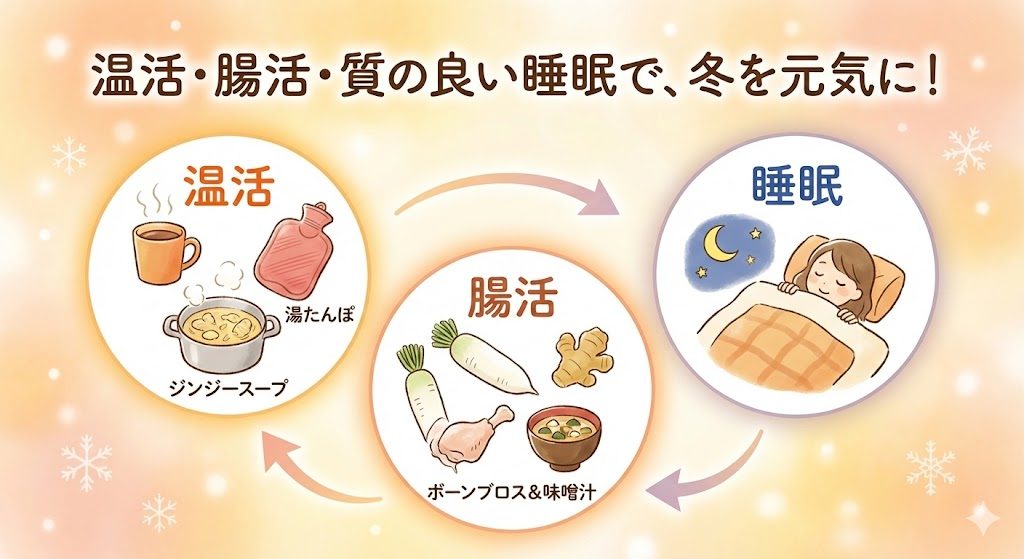 私はこの冬始めたのは温活・腸活・質の良い睡眠です。
