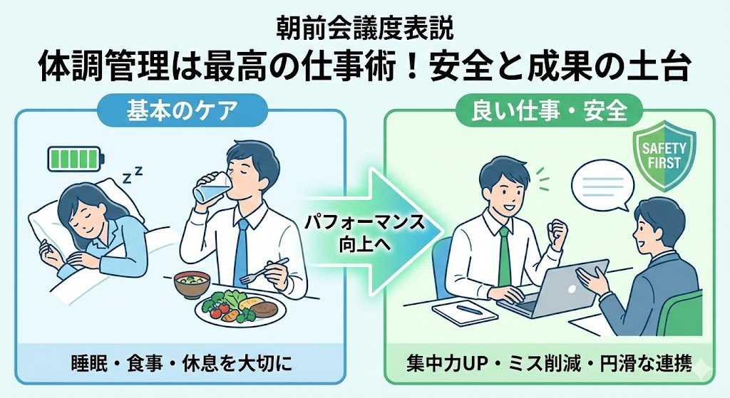 今日も一日、自分の体を大切にしながら、安全第一で仕事に取り組んでいきましょう。