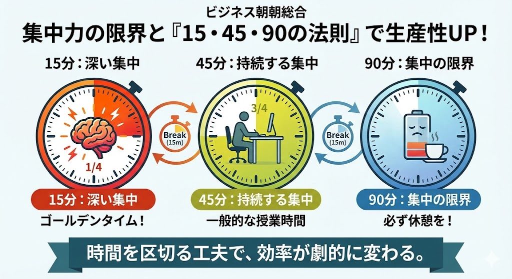 実はヒトの集中力は、一般的に90分が最大の限界と言うことを知っていますか?さらに深い集中状態は約15分ほどしか続かないそうです。